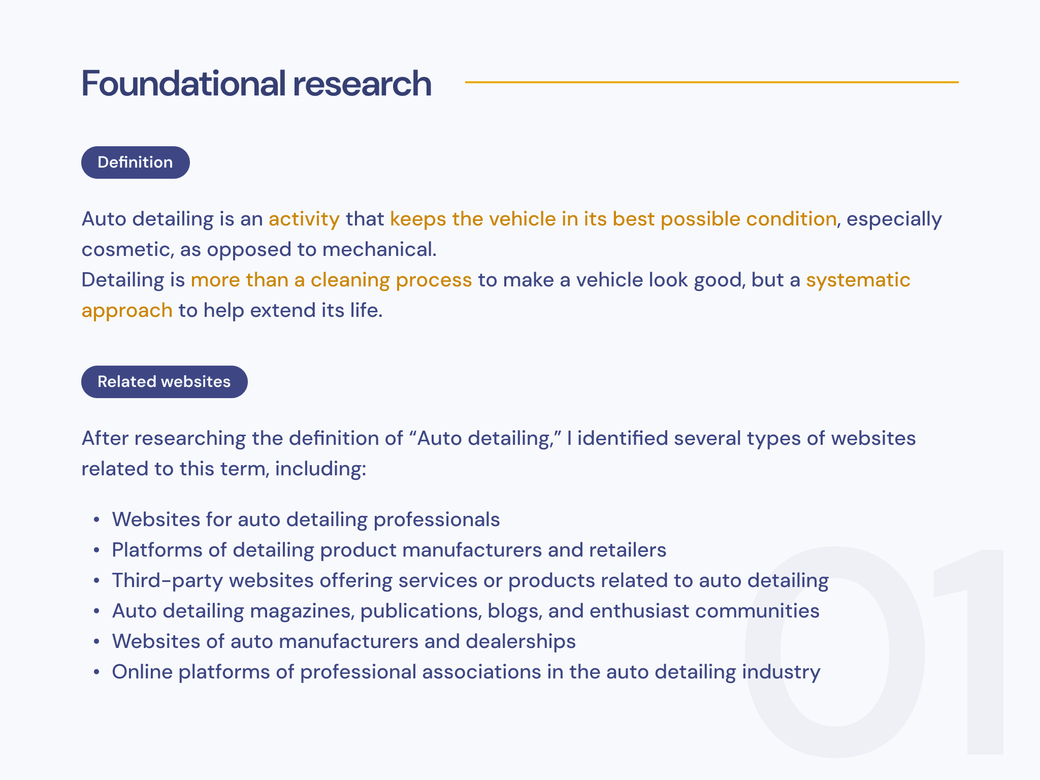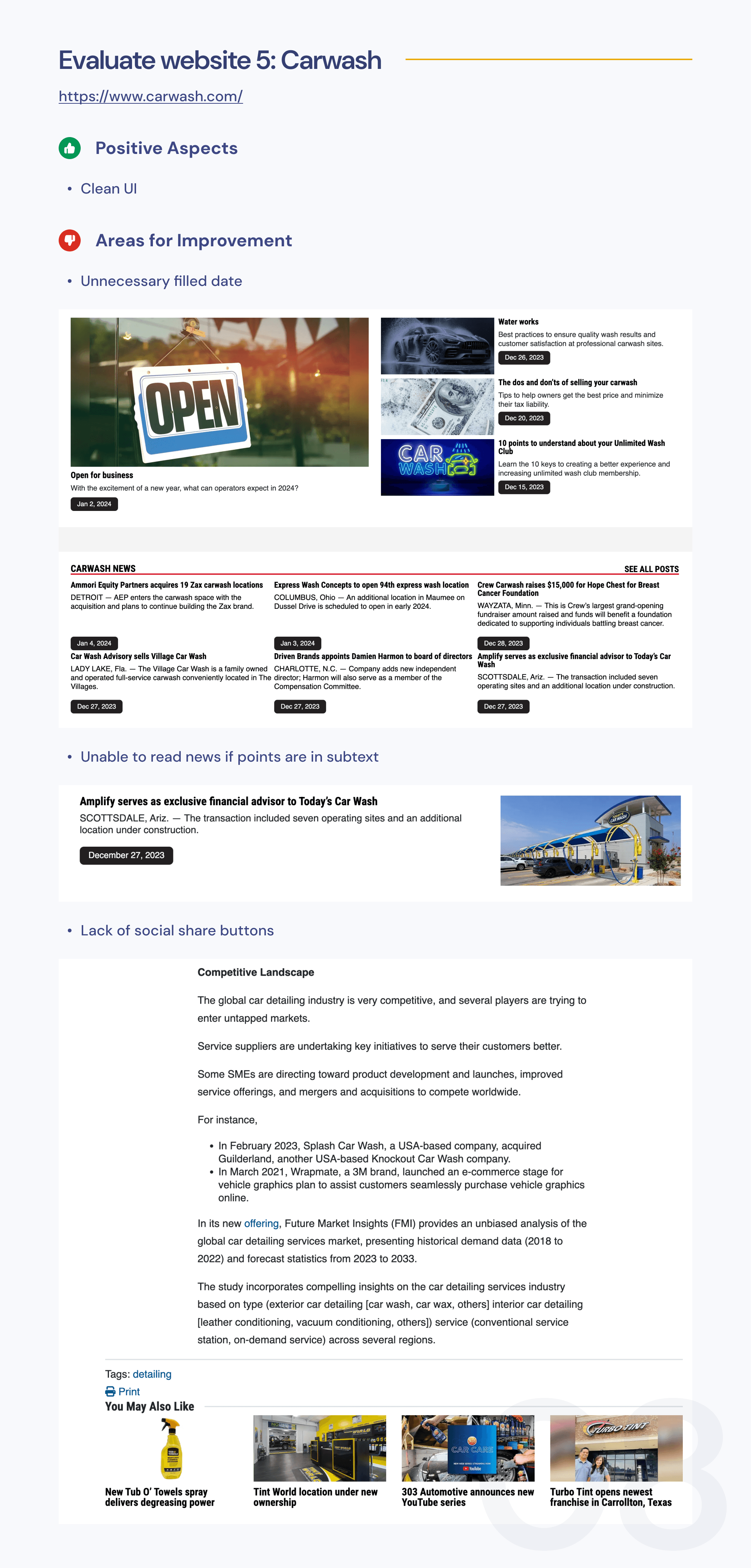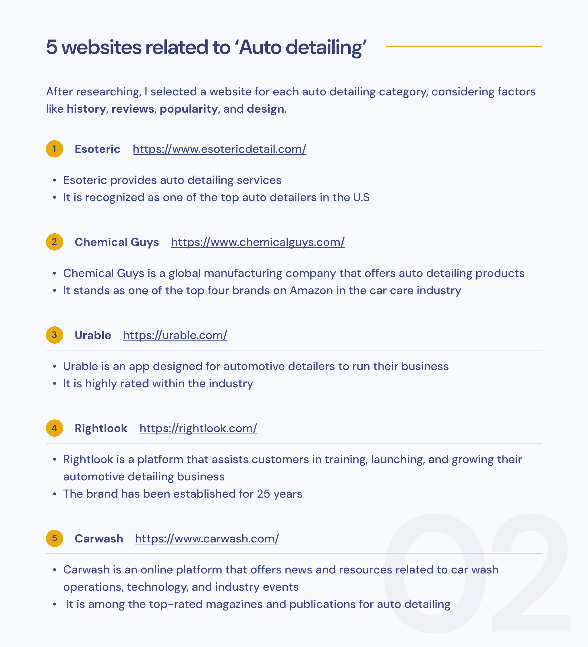 In this project, my responsibility is to find at least 5 websites related to 'Auto Detailing,' provide the rationale behind my selection, and highlight both the positive and negative aspects of each website.
