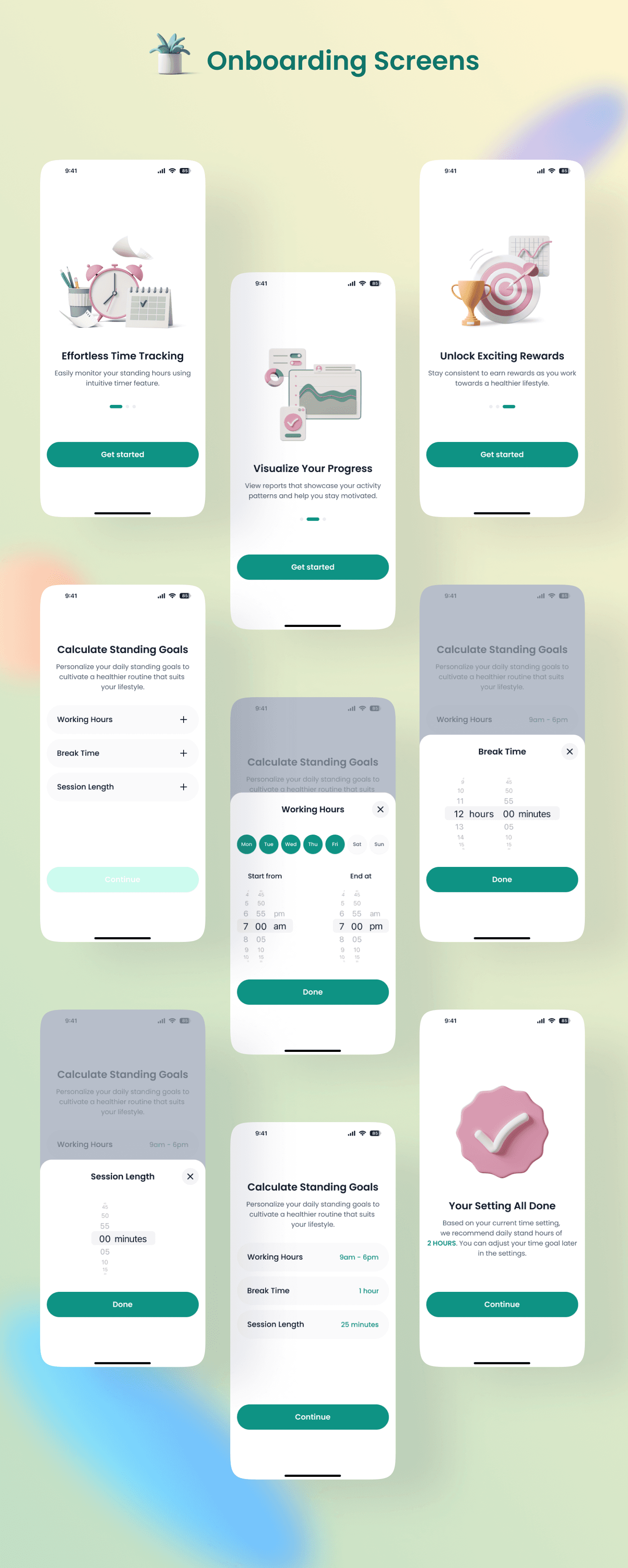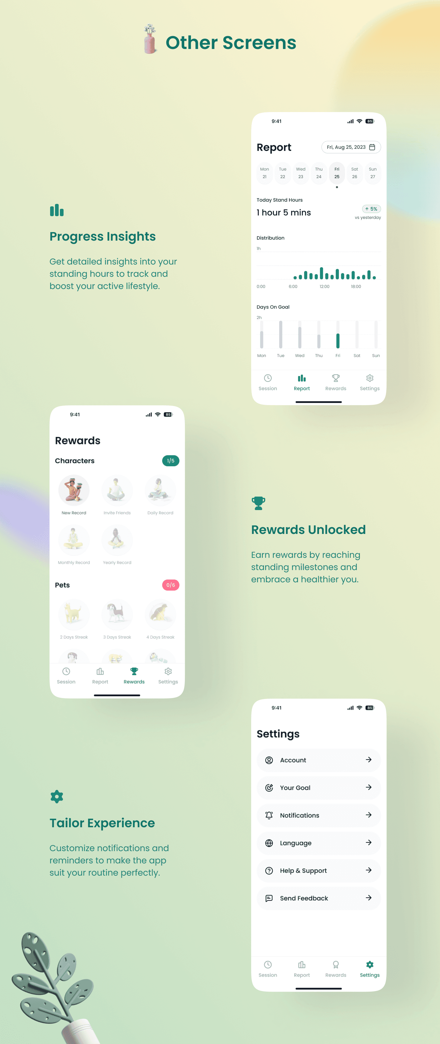 Regarding the session screens, my aim was to create a streamlined and minimalist interface that enhances user experience during their sessions. The design features intuitive stand hours goal, a dynamic animated figure, and straightforward button options to injects a sense of vibrancy and effectiveness into the app's functionality.