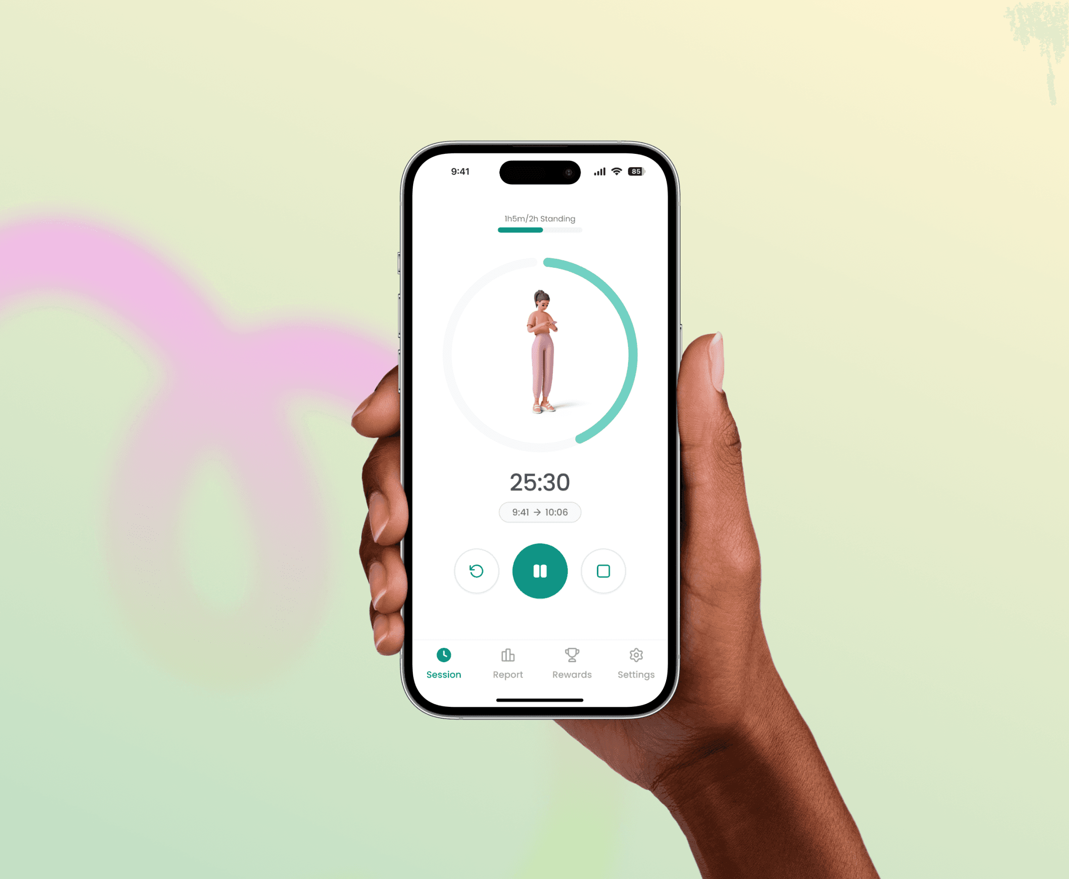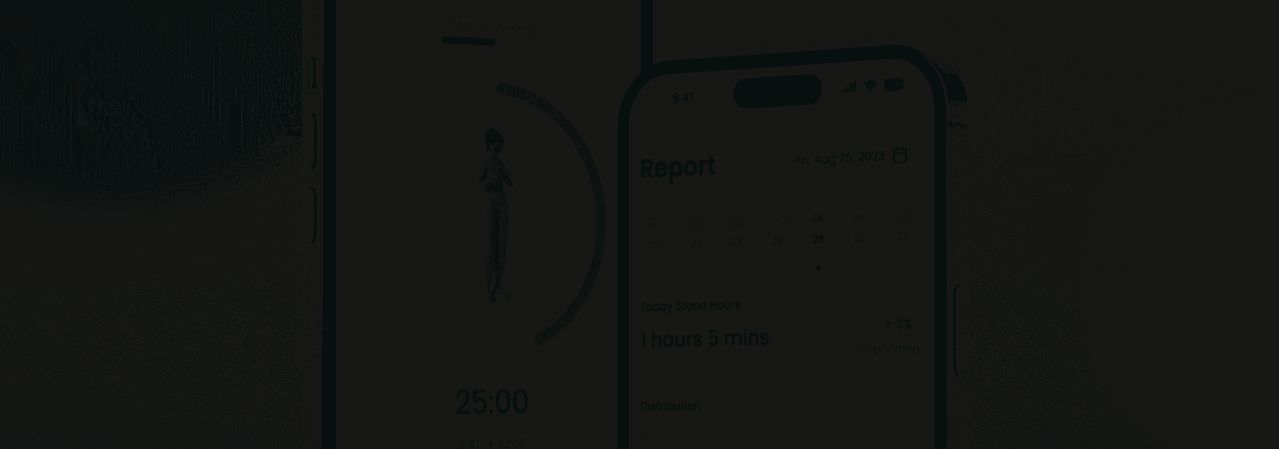 For the session screens, I wanted to design a very clean and simple interface to help users navigate their session easily. Intuitive standing hours, animated figure, and simple button set make the app more efficient and lively.